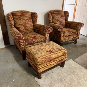 High End Rustic Tan and Burgundy Navajo Print Wing Back Chairs with Log Legs and Matching Ottoman, by Old Hickory Furniture Co.