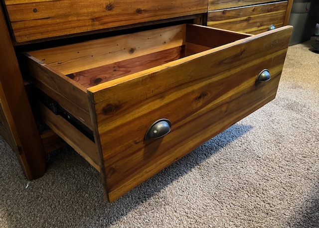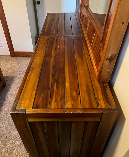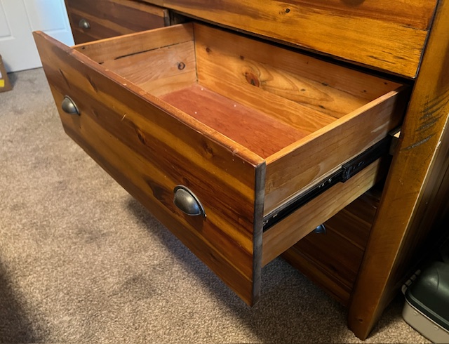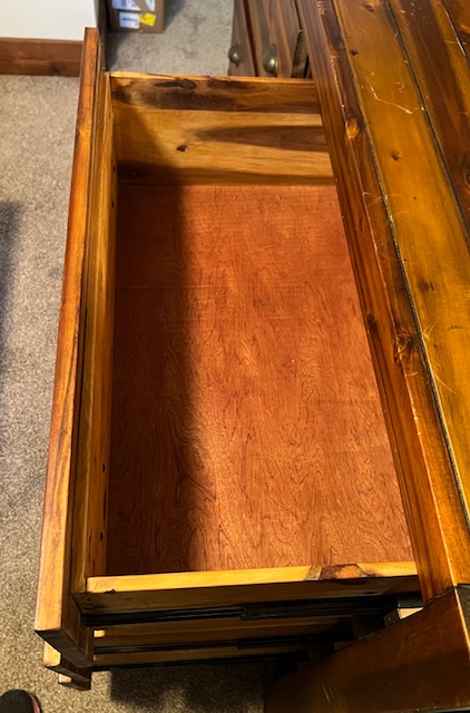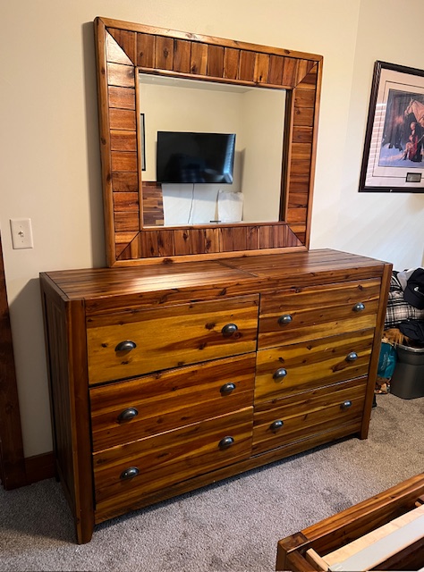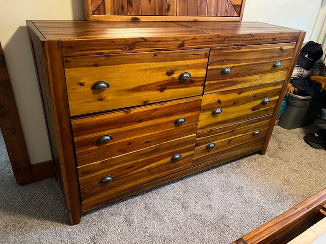 Six-Drawer Rustic Solid Wood Dresser (without mirror): Sturdy and in great condition! Top right drawer is missing a handle, which could be replaced. One of the drawers doesn’t quite close all the way, but almost. 62.25″ long x 18″ deep x 39″.