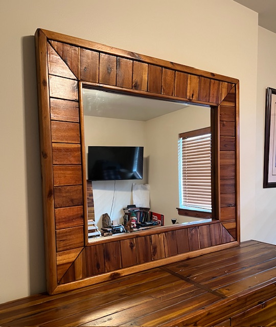 Six-Drawer Rustic Solid Wood Dresser with Mirror: Sturdy and in great condition! There are boards included to attached the mirror to the dresser. One of the drawers is missing some glide pieces, but it still opens and closes fine. 62.25″ long x 18″ deep x 39″ dresser height and 77″ overall height, including mirror.