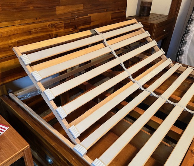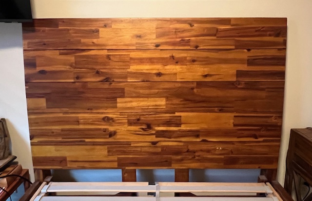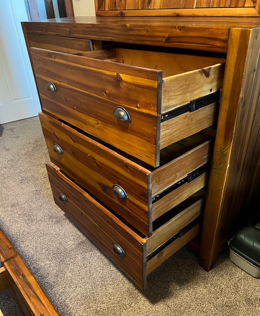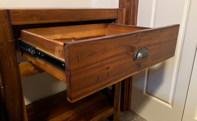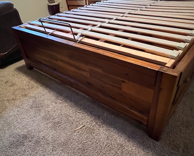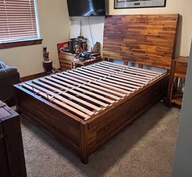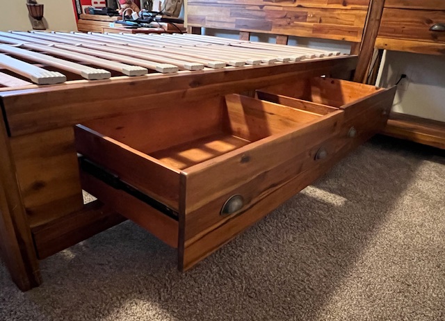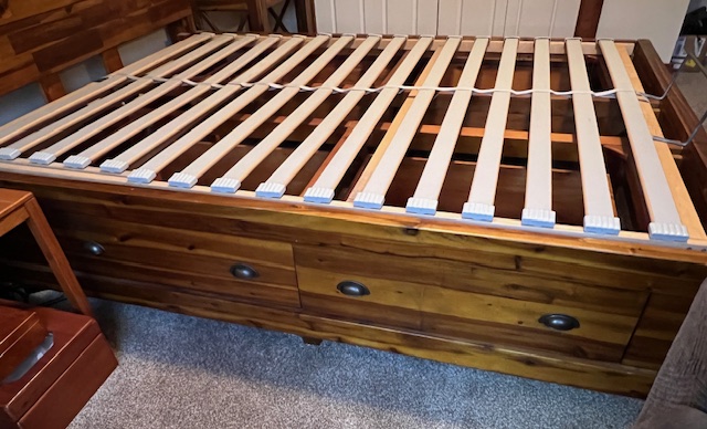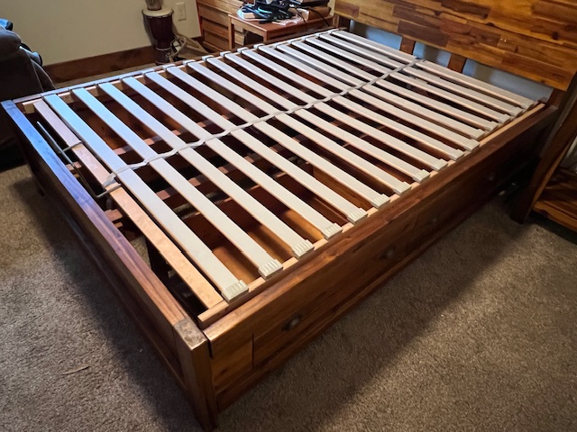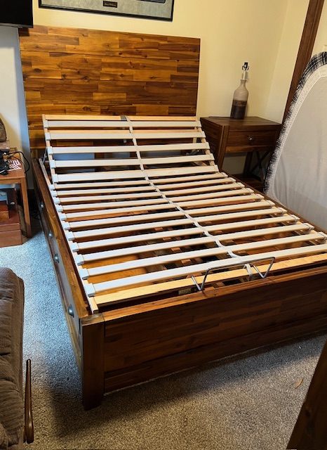 Four-Drawer Rustic Solid Wood Full Size Platform Bed with Large Solid Panel Headboard and Adjustable Head Incline: Sturdy and in great condition! There are 2 drawers on each side of the bed frame. There are two drawer handles missing on one of the bed frames, which could be replaced. Pliable memory foam mattress should be used with this type of bed frame, due to the adjustable head incline. There is a steel piece at the foot of the bed to keep the mattress in place when the head is inclined. 57″ wide x 82.5″ long x 55″ headboard height and 17.5″ footboard height. Two (2) available.