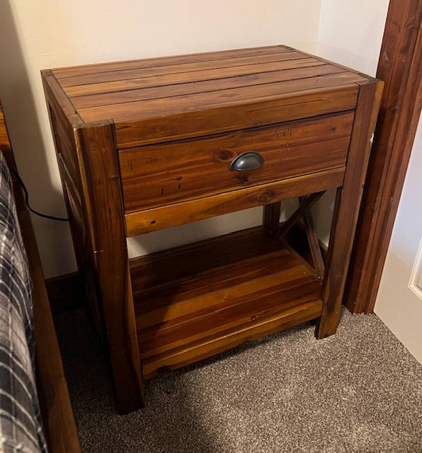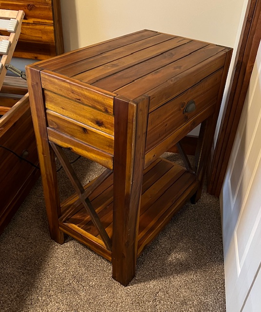 Rustic Solid Wood TALLER Night Stand with Top Drawer, Lower Shelf, and X Design: Sturdy and in excellent condition! 26″ wide x 16″ deep x 29.5″ tall. Two (2) available.