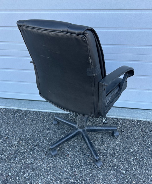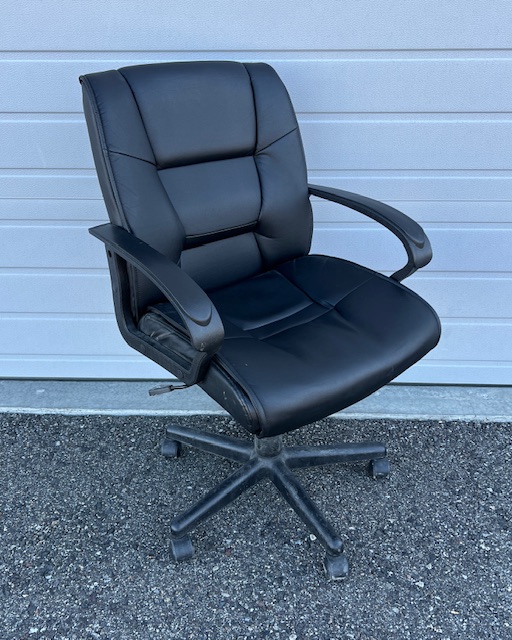Black Bonded Leather Mid-Back Rolling Office Chair with Arms (SKU# CB5/1364):  Comfortable and in nice condition!  There are a couple places along back edge that have been patched with black electrical tape.
