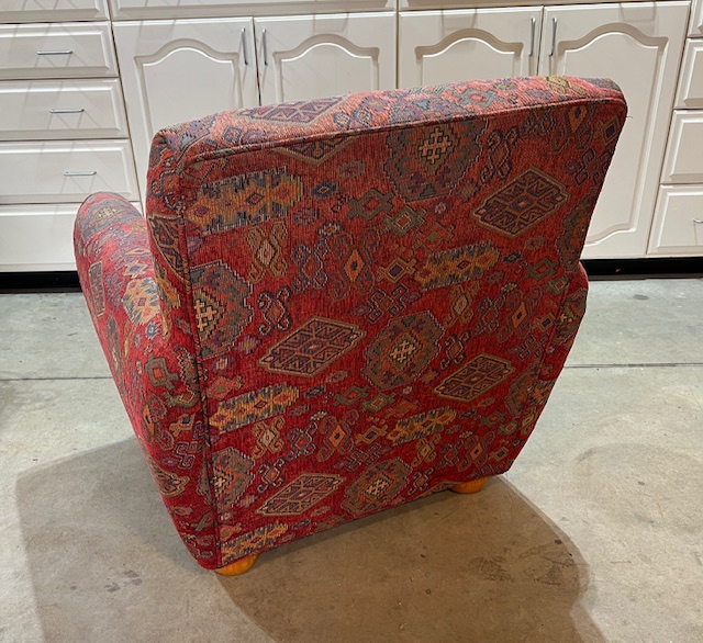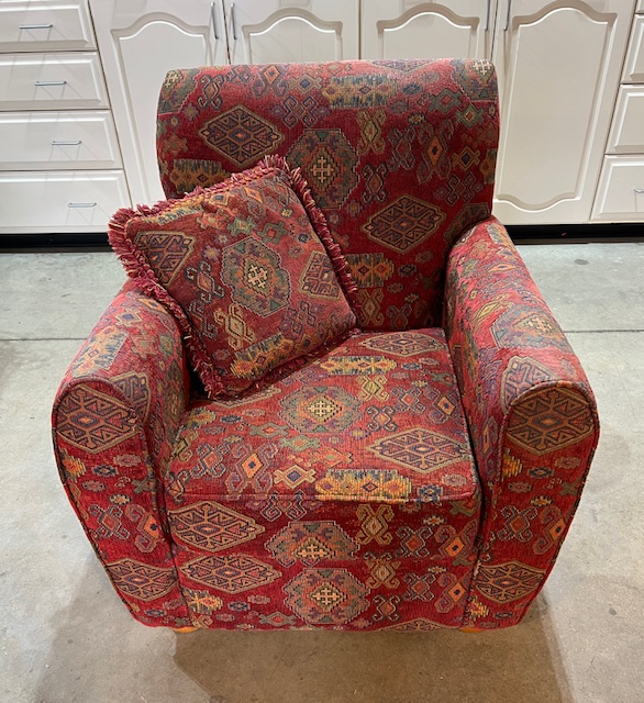 Burgundy/Rust Aztec Print Pier 1 Club Chair with Matching Ottoman and Throw Pillow (SKU# CB6/248): Comfortable and in nice condition, with no stains or tears.