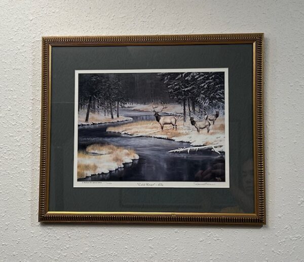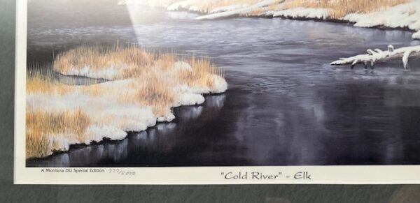 “Cold River” Elk Framed Matted Numbered Montana Ducks Unlimited Print by Darrell Davis: Great condition! 21″ wide x 18″ tall.