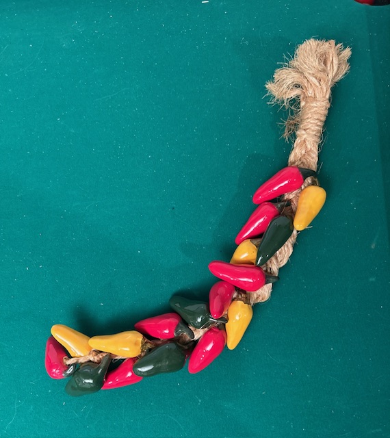 Colorful Vintage Ceramic Chili Peppers Wall Hanging (SKU# CB5/1143): Excellent condition! 23.5″ long x 3.5″ wide.