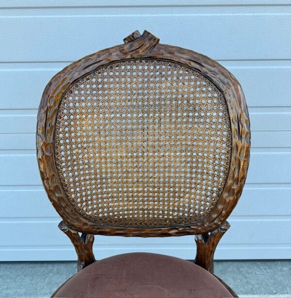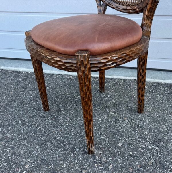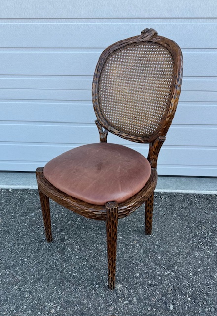 Distressed Antique Wooden Log Style Accent Chair with Padded Faux Leather Seat and Wicker Back (SKU# CB5/822). Very sturdy and in good condition, with some discoloration on the seat. Seat height is 18″.