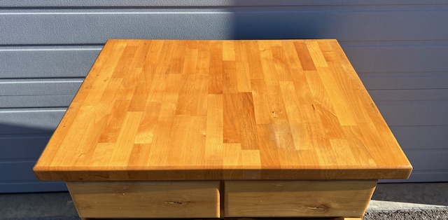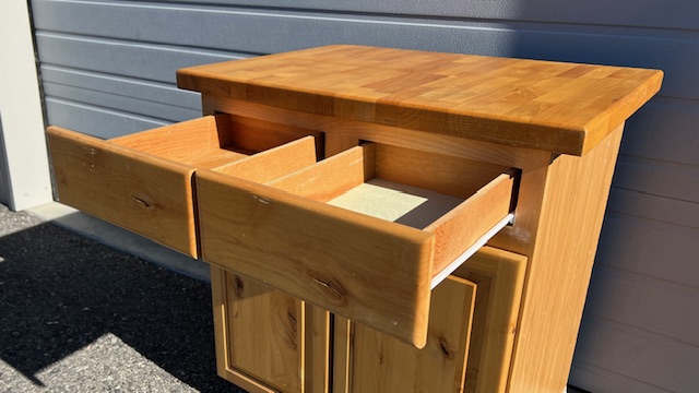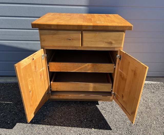 Four-Drawer Solid Wood Butcher Block Kitchen Island (SKU# CB5/1447):  Sturdy and in great condition, with a little bit of wear.  Drawers are on glides and slide smoothly.  Heavy duty butcher block top with beautiful wood grain.  34″ wide x 25″ deep x 36.5″ tall.