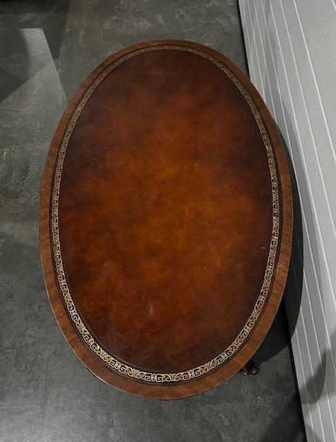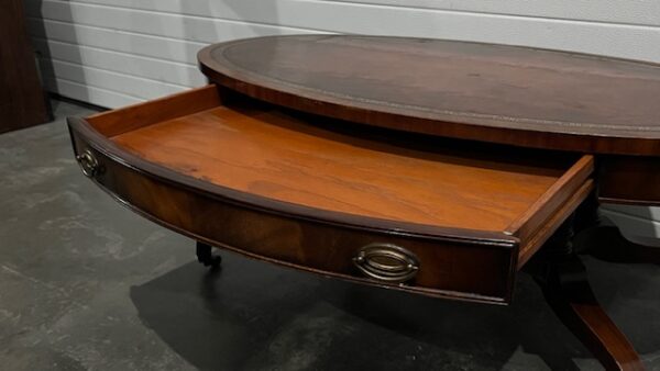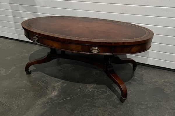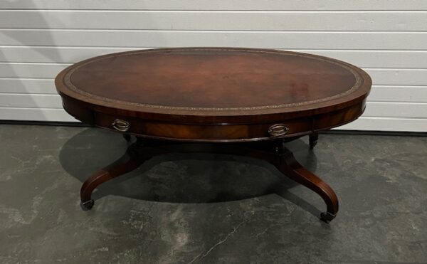 Heirloom Weiman Oval Mahogany Coffee Table on Antique Casters, with Dovetailed Drawer and Leatherette Top (SKU# CB5/1132):  Sturdy and in great condition, with a little bit of wear.  Drawer slides smoothly.  40″ long x 24″ deep x 17″ tall.