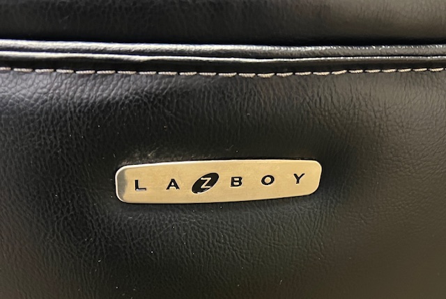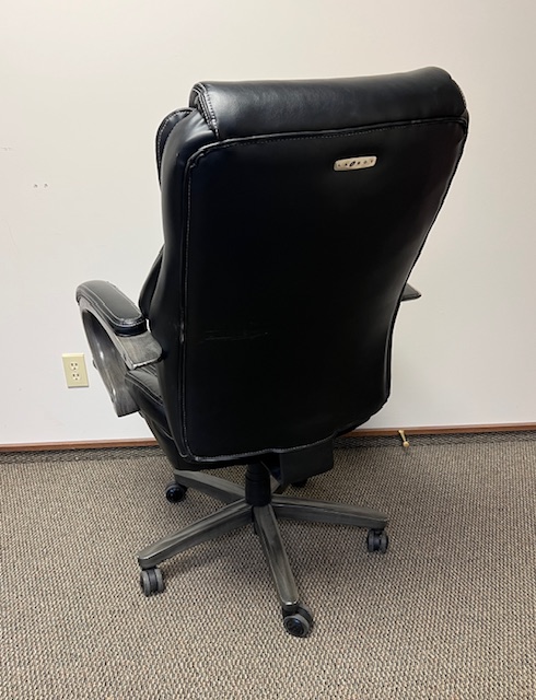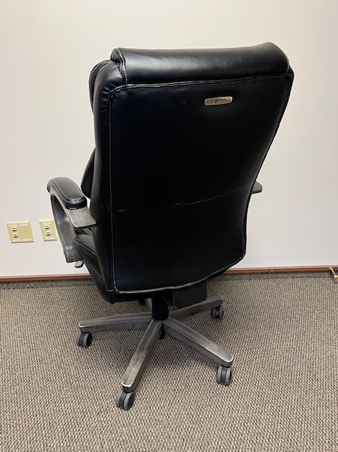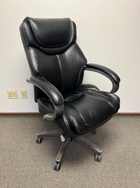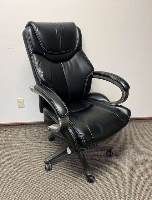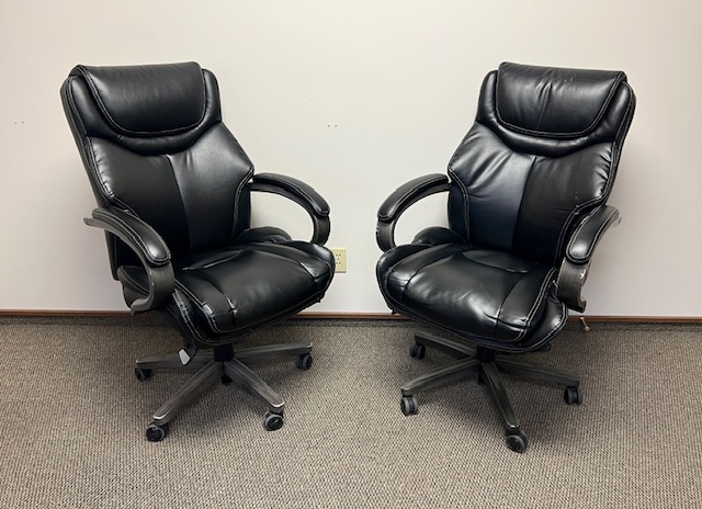 High End Black Leather La-Z-Boy Executive Office Chairs. Comfortable, quality chairs! Seat height is adjustable, and there is a lever that allows it to lean back and rock. The one on the left is in excellent condition for $150. The one on the right is in overall great condition, with a little bit of wear on the arms, as seen in the 2nd photo, for $125.