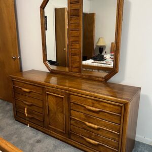 High End Custom Amish Crafted 13-Drawer Solid Oak Dresser with Trifold Mirror: Well cared for and in excellent condition! Drawers slide smoothly. 63” wide x 18” deep x 37” dresser height and 84.5” overall height.  $695  (Matching armoire also available.)