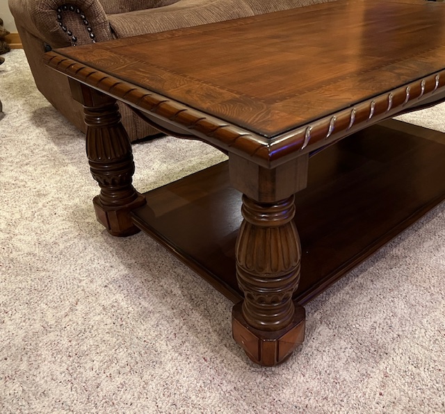 High End Dark Brown Solid Wood 2-Level Coffee Table with Carved Posts: Sturdy and in excellent condition! 50″ long x 30″ wide x 20″ tall. $235