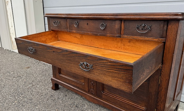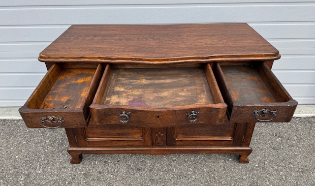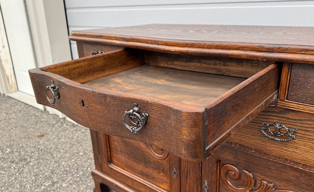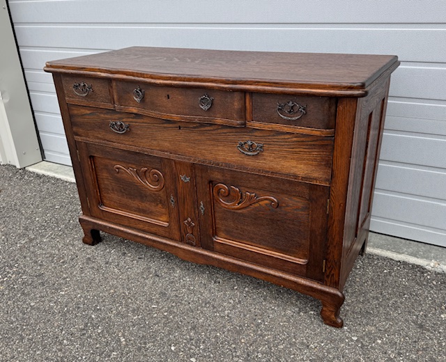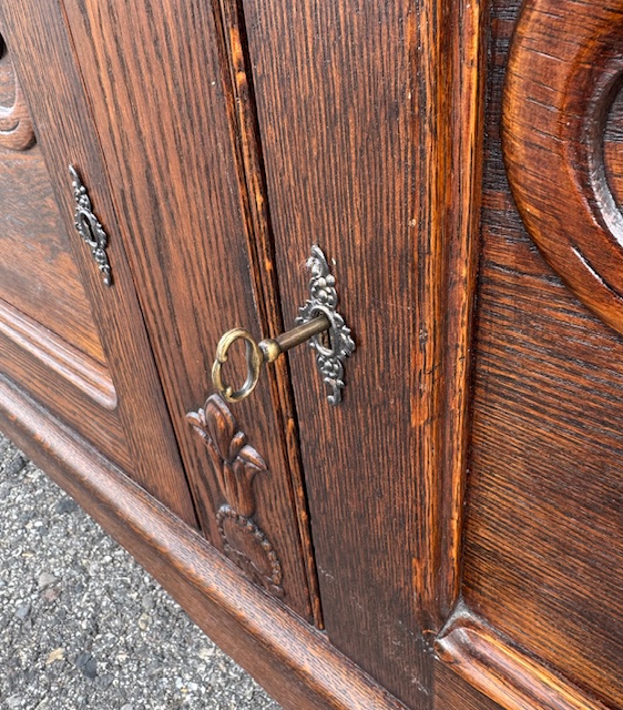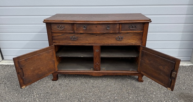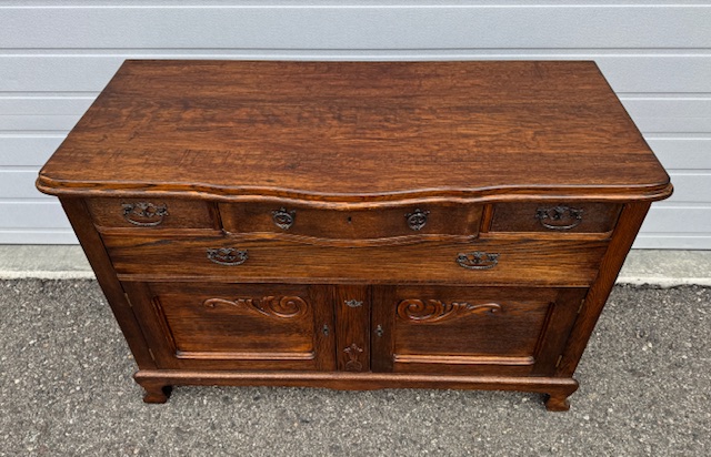 High End Dark Solid Oak Antique 4-Drawer Buffet with Carved Detail and Locking Lower Cabinet: Beautiful, quality piece, well cared for and in great condition! Drawers work well. Antique key included. 53.5″ long x 25″ deep x 36″ tall.