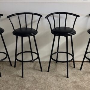 Black Metal Swivel Bar Height Stools with Curved Backs and Padded Vinyl Seats ($30 each)