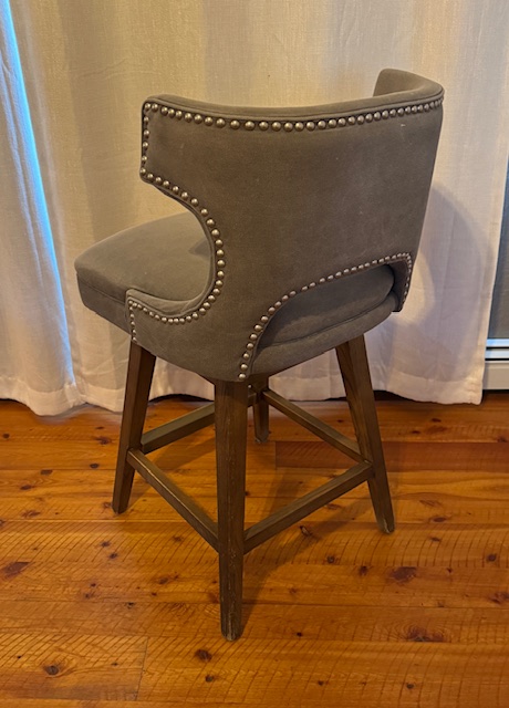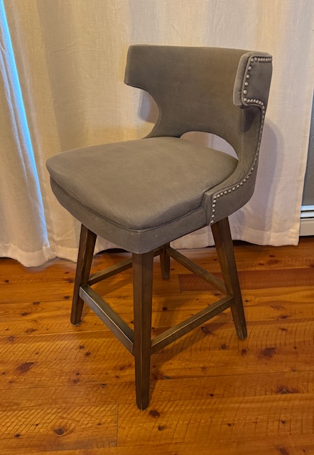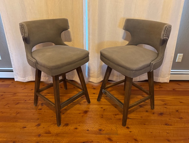 High End Gray Padded Canvas Counter Height Swivel Stools with Rivets and Solid Wood Legs (SKU# CB6/3): Quality stools . . . comfortable, very sturdy, and in good condition! Fabric could use a little cleaning. From a nonsmoking home. Seat height is 25.5″. Two (2) available at $70 each. Sold as a set for $140.