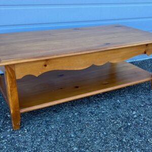 High End Rustic Solid Oak Lift Top Coffee Table from Conlins witih Side Shelves and Divided Glass Doors (SKU# CB5/830): Sturdy and in excellent condition! Doors work well and close securely. Top extends forward on hinges – could be used in front of a couch for writing or eating. 48″ long x 28″ deep.