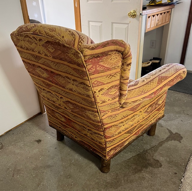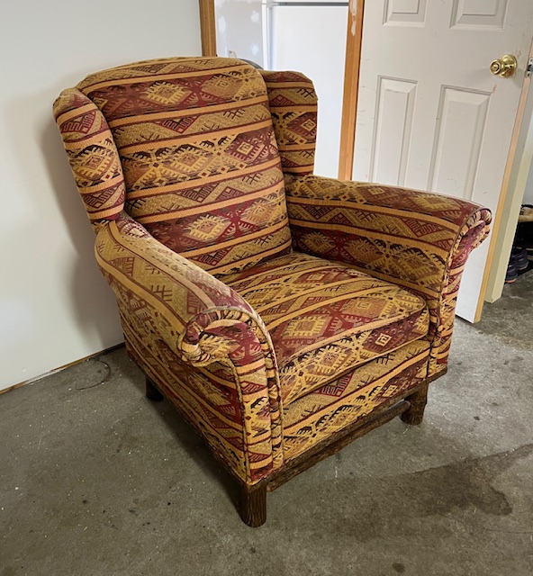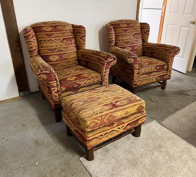 High End Rustic Tan and Burgundy Navajo Print Wing Back Chairs with Log Legs and Matching Ottoman, by Old Hickory Furniture Co: Sturdy, comfortable, and in good condition! No stains or tears. Fabric has faded a bit from its original color. Chairs are 38″ wide x 34.5″ deep x 19″ seat height and 39″ back height. Sold as a set of 3. Available after December 29. Feel free to contact us now to arrange a time for viewing/pickup.