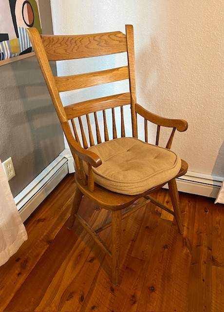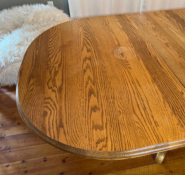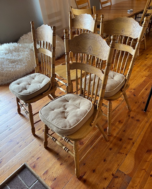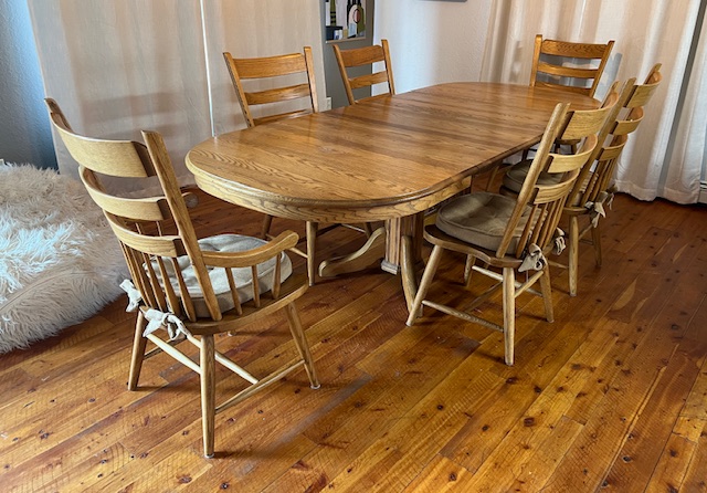 Set of 4 High End Pressback Solid Oak Dining Chairs which could be added to this set for additional seating. Chairs are heavy, sturdy, and in excellent condition! Available after December 29. Feel free to contact us now to arrange a time for viewing/pickup.