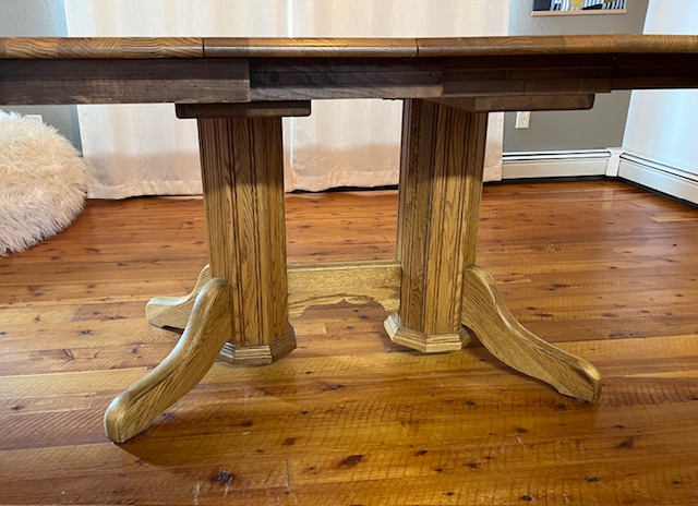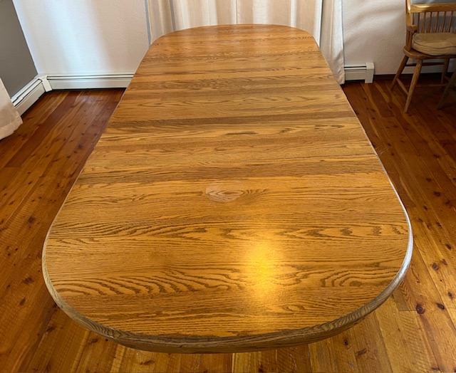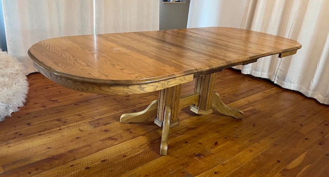 High End Solid Oak Oval Double Pedestal Dining Table with 4 Leaves and 6 Chairs, by Richardson Brothers Company: Sturdy and in excellent condition! Table has a quality mechanism to receive the leaves. There are a couple of spots of discoloration on tabletop. Table is 98″ long x 41.5″ wide x 30″ tall with all 4 leaves inserted and 54″ long without the leaves. Chairs are rock sturdy. Seat cushions included. Available after December 29. Feel free to contact us now to arrange a time for viewing/pickup.