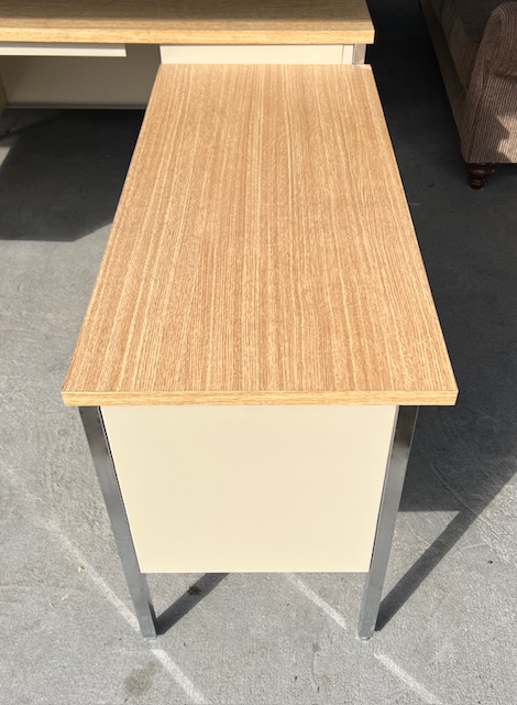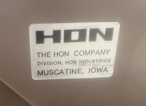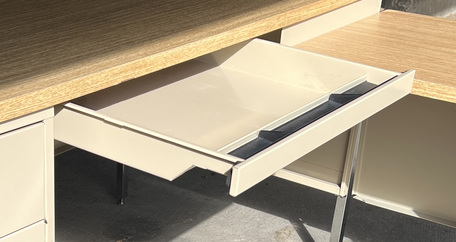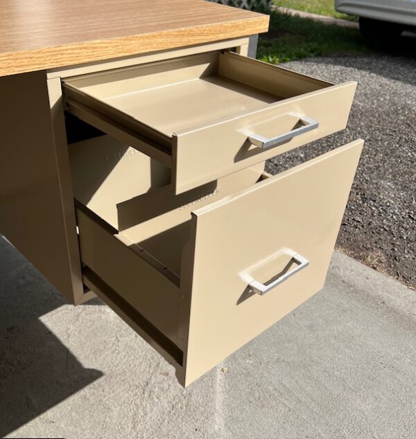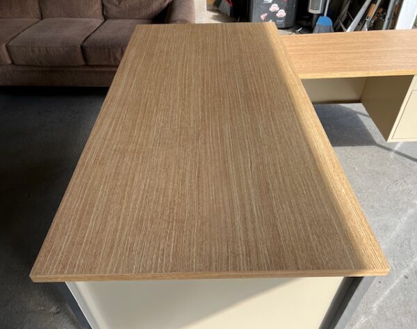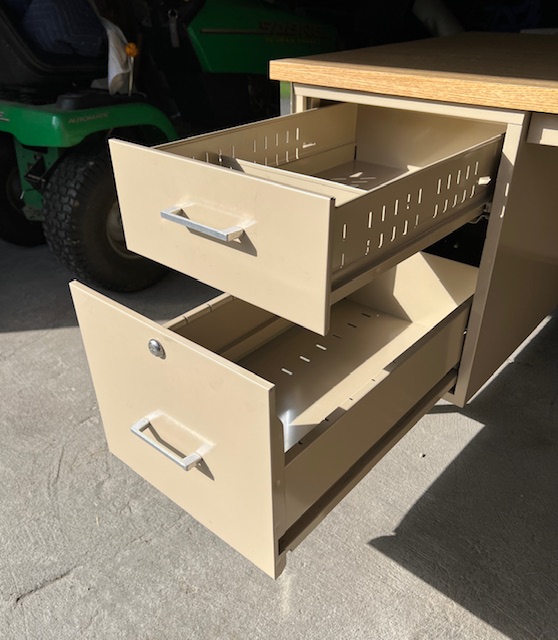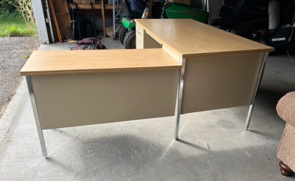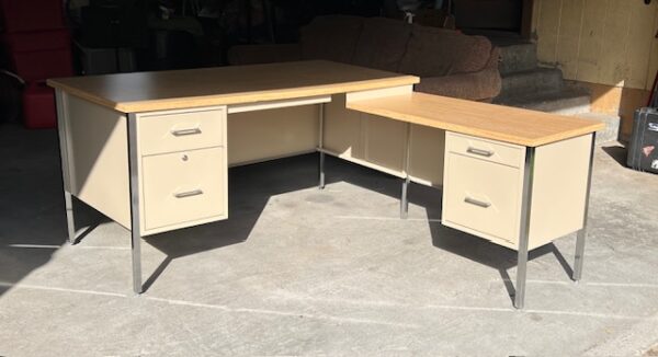 HON 5-Drawer Steel L-Shaped Office Desk with 2 File Drawers and Commercial Grade Pressboard Top (SKU# CB5/1283):  Sturdy and in excellent condition!  Drawers work well.  Steel file folder frames for hanging files are included for both file drawers (not shown in pictures).  Key not included, but both drawers on left side lock, and a key could be made using code on lock cylinder.  Main section of the desk is 60″ long x 30″ deep x 29.5″ tall.  Return is 40″ long x 18.5″ deep x 26.5″ tall.  There are 70″ from back corner to end of return.