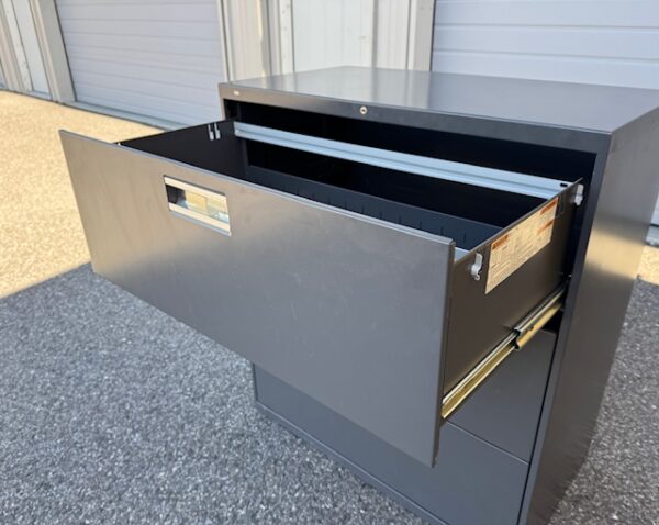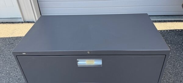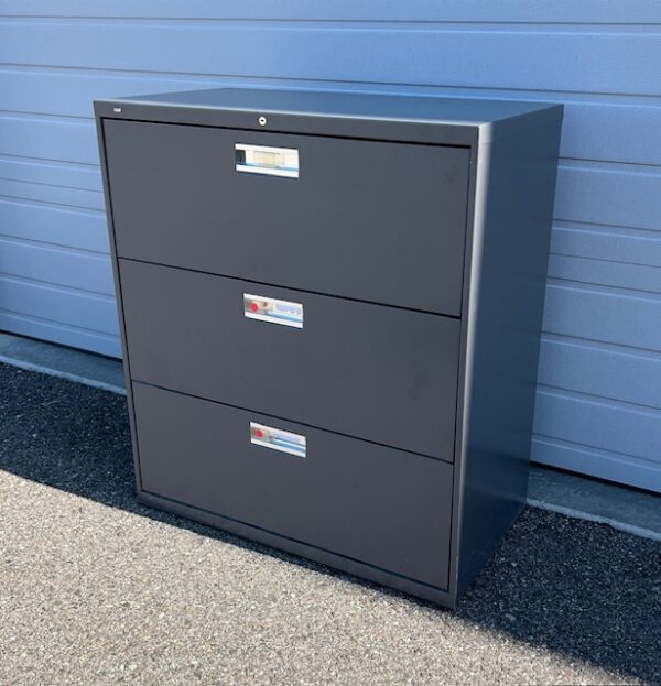 HON Charcoal Gray 3-Drawer Lateral Steel File Cabinet with LOCK (SKU# CB5/1324):  High end file cabinet in great condition!  There are some minor scratches on the file cabinet.  Drawers slide smoothly.  Key not included, but a key could be made, using code on lock cylinder.  36″ long x 19.25″ deep x 41″ tall.  (These cost $895 new.)  $250
