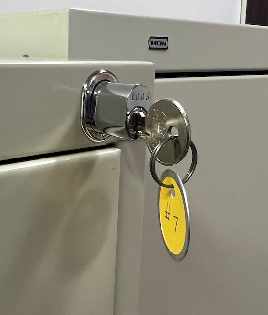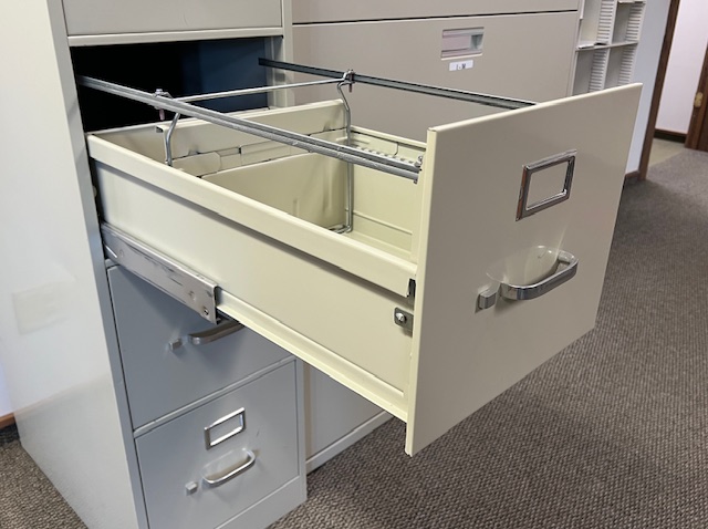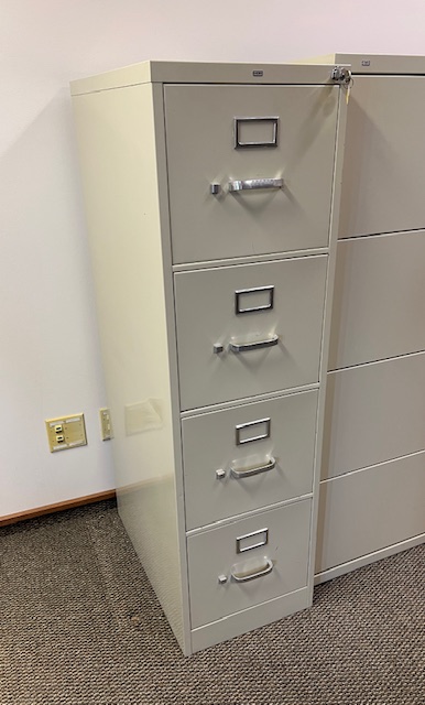 HON Putty Color 4-Drawer Letter Size File Cabinet with LOCK and KEY:  Sturdy and in great condition!  Drawers work well and include steel bars for hanging files.  15″ wide x 52″ tall.