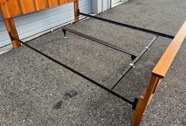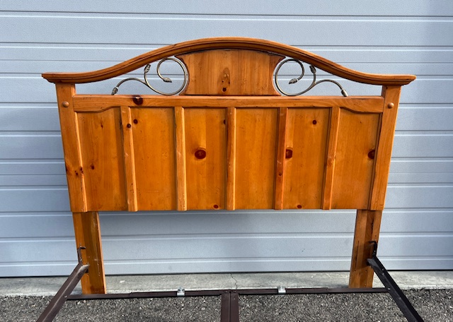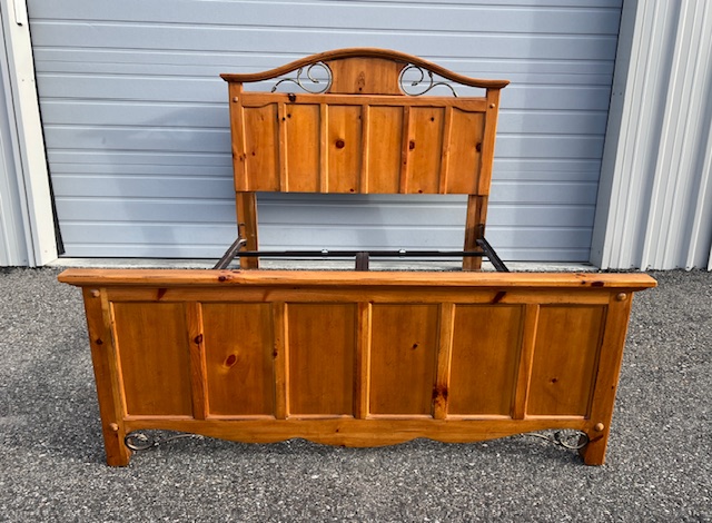 Knotty Pine Queen Bed Frame with Steel Trim (SKU# CB6/61):  Sturdy and in great condition!  Includes headboard, footboard and connecting steel frame.  65.5″ wide x 85.5″ long x 53″ headboard height and 25.5″ footboard height.  $295