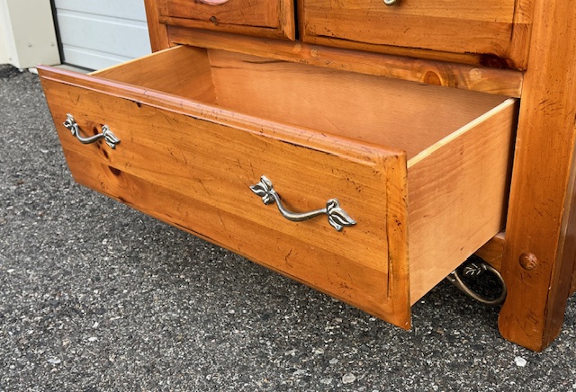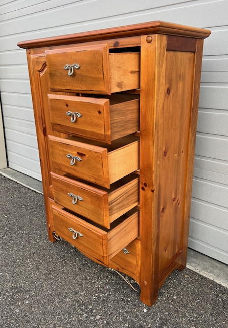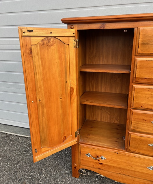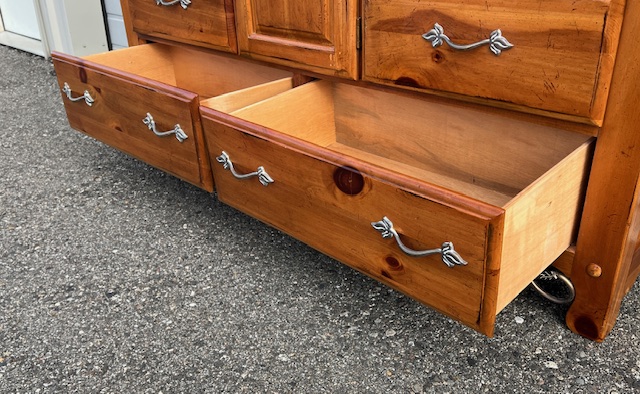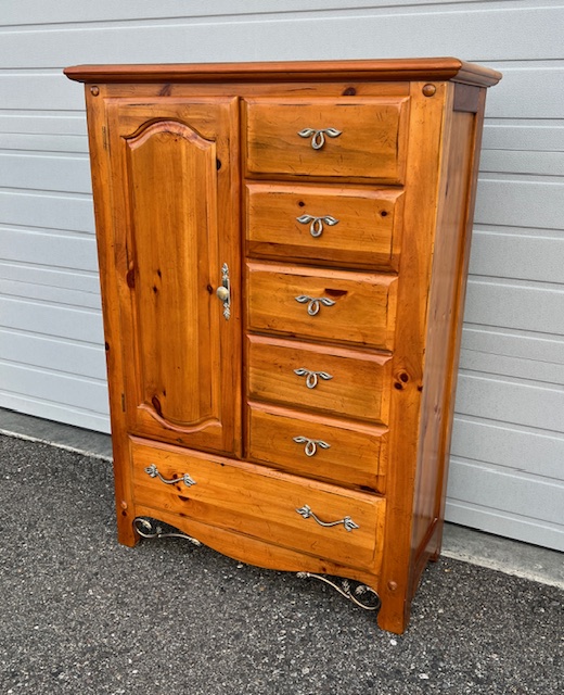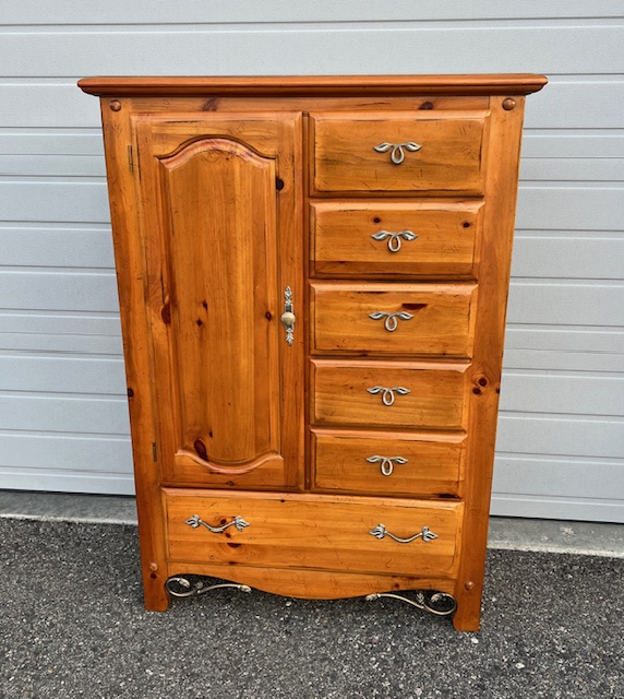 Six-Drawer Knotty Pine Gentleman’s Chest/Armoire with Cabinet/Shelves (SKU# CB6/63):  Sturdy and in great condition!  40″ wide x 18″ deep x 56.5″ tall.  $395