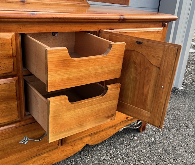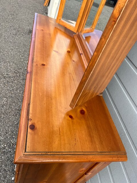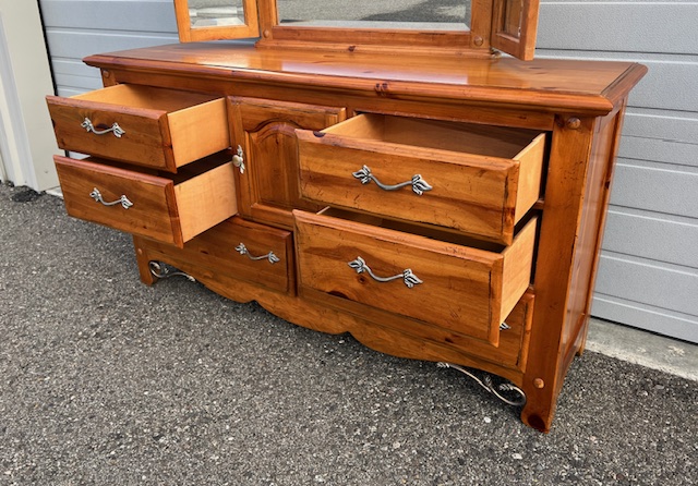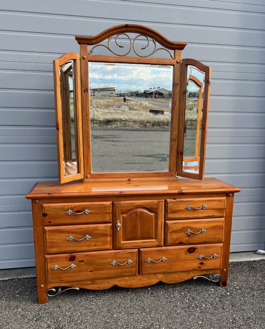 Eight-Drawer Knotty Pine Horizontal Dresser with Steel Trim and Trifold Mirror (SKU# CB6/62):  Sturdy and in great condition!  64″ long x 18″ deep x 34.5″ dresser height and 83″ overall height, including mirror.  $395
