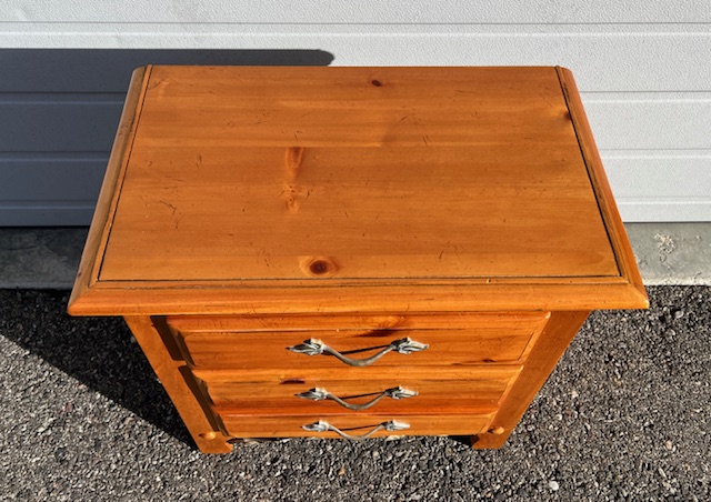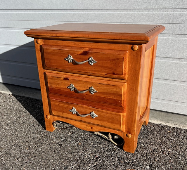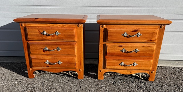 Two-Drawer Knotty Pine Bedside Tables with Steel Trim and Deep Bottom Drawer (SKU# CB6/60):  Sturdy and in great condition!  26″ wide x 16.5″ deep x 25.5″ tall.  Two (2) available at $135 each.  Sold as a set for $270.