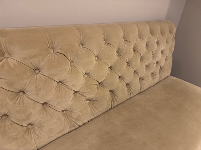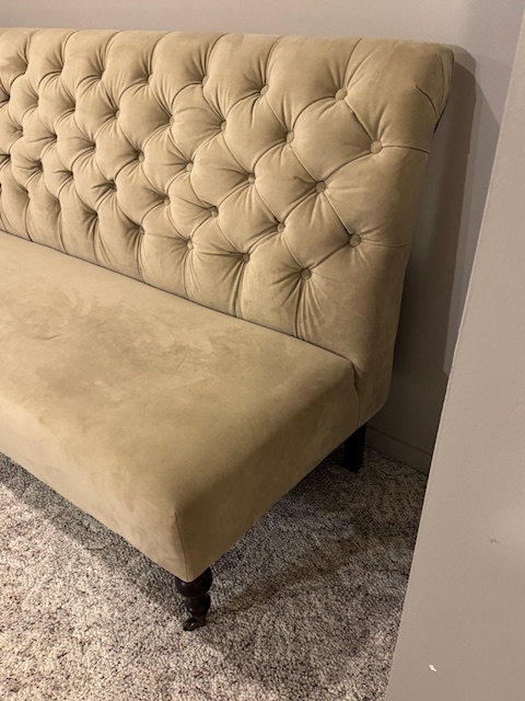 Light Brown Microfiber Bench or Sofa with Tufted Back and Mahogany Legs, on Antique Casters:  Comfortable and in great condition!  There is an area of discoloration along left side toward the back. From a nonsmoking home.  65” long x 29” deep x 19” seat height and 38” back height.