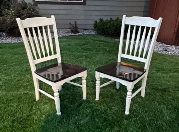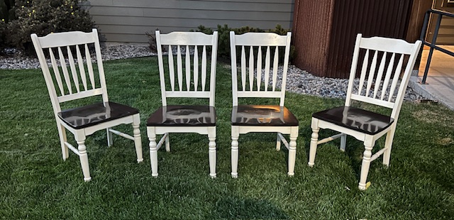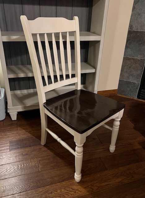 LIKE NEW Quality White Wooden Dining Chairs with Dark Brown Contour Seats (SKU# CB5/1328): Rock sturdy! 18″ wide x 17.5″ deep x 17.5″ seat height and 37.5″ back height. (These cost $100 each new.). Four (4) available at $60 each, sold as a set for $240.