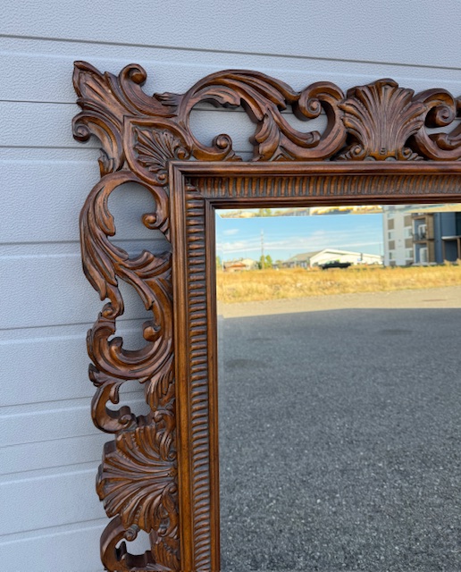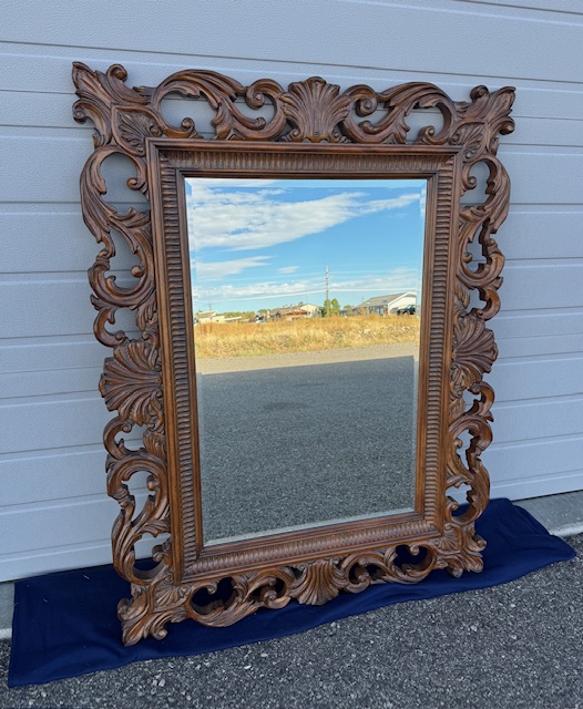 LIKE NEW End Antique Ornate Solid Wood Framed Beveled Glass Wall Mirror (SKU# CB5/1290): 40″ wide x 2″ deep x 51″ tall.