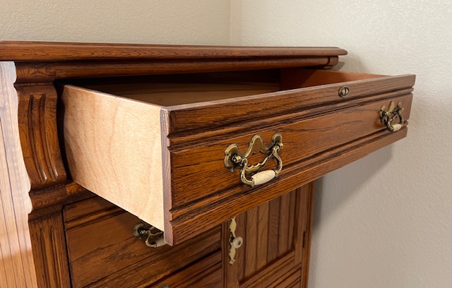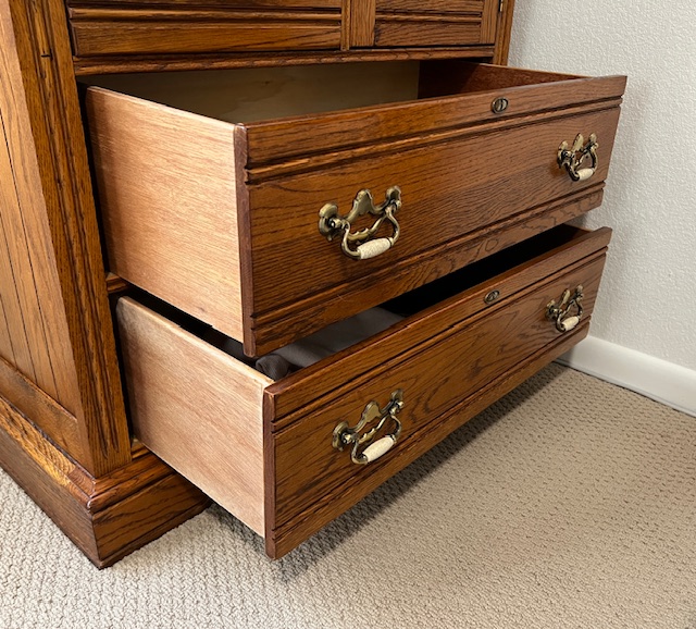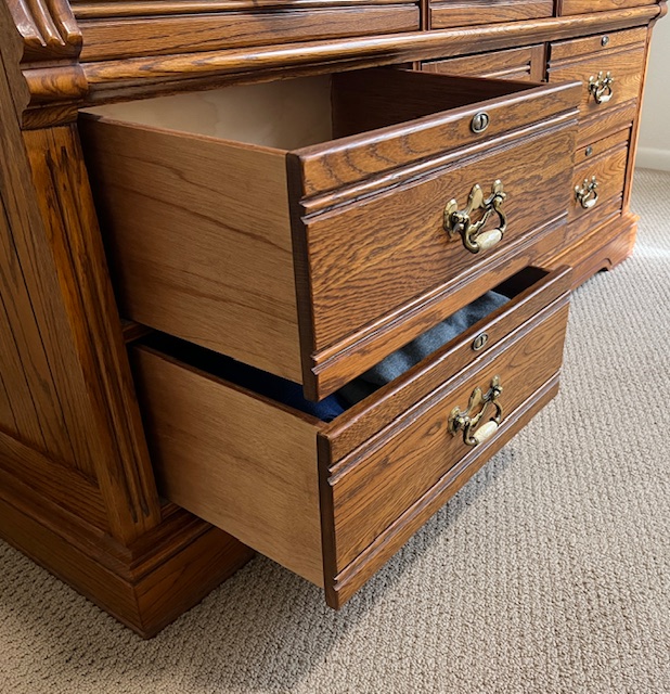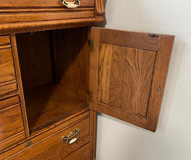 LIKE NEW High End Lexington Recollections 5-Drawer Solid Oak Vertical Dresser with Cabinet (SKU# CB6/131): 36″ wide x 19″ deep x 51″ tall.