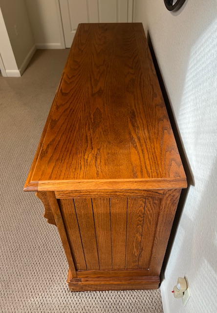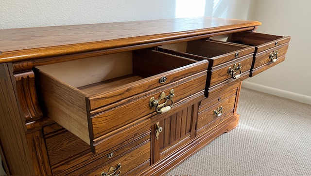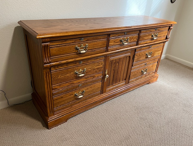 LIKE NEW High End Lexington Recollections Solid Oak 9-Drawer Horizontal Dresser (SKU# CB6/132): 64″ long x 19″ deep x 33″ tall.