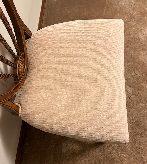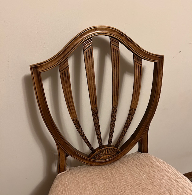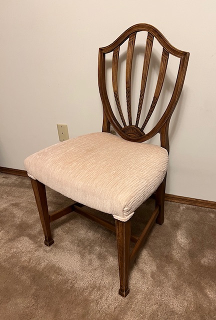 LIKE NEW Mid-Century Solid Wood Shield Back Side Chair with Carved Detail and Beige Padded Seat (SKU# CB5/1537): Beautiful, sturdy chair! Dimensions will be posted soon.