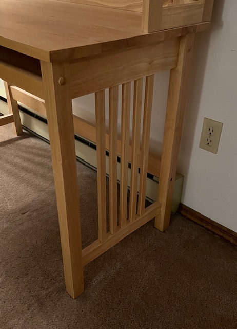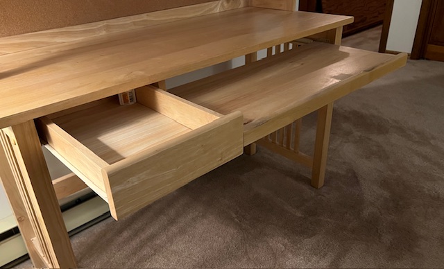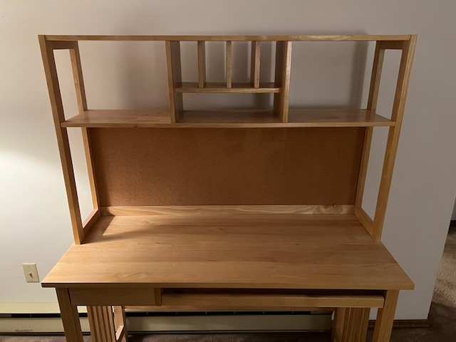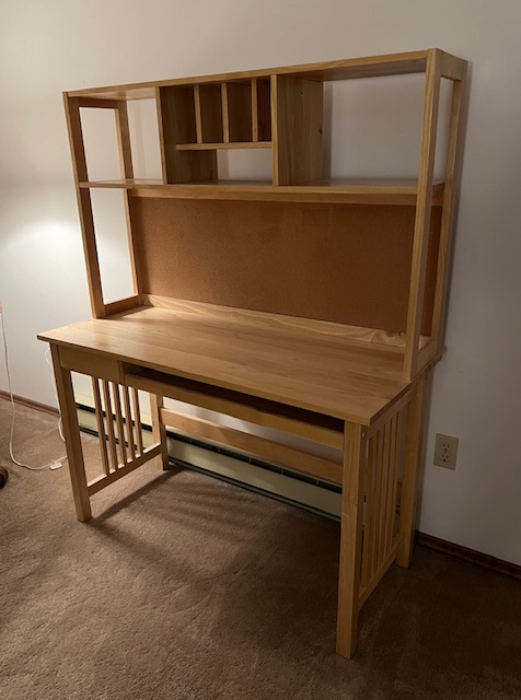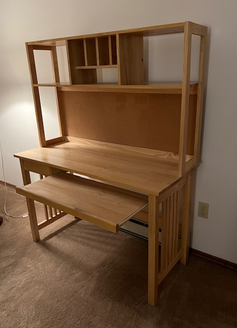 LIKE NEW Pine Mission Style Computer Desk with Hutch and Bulletin Board (SKU# CB5/1527):  Includes keyboard tray and small utensil drawer on glides, bulletin board, and divided shelf.  Sturdy, quality piece!  47.5″ long x 20.5″ deep x 29″ desk height and 58.5″ overall height, including hutch.