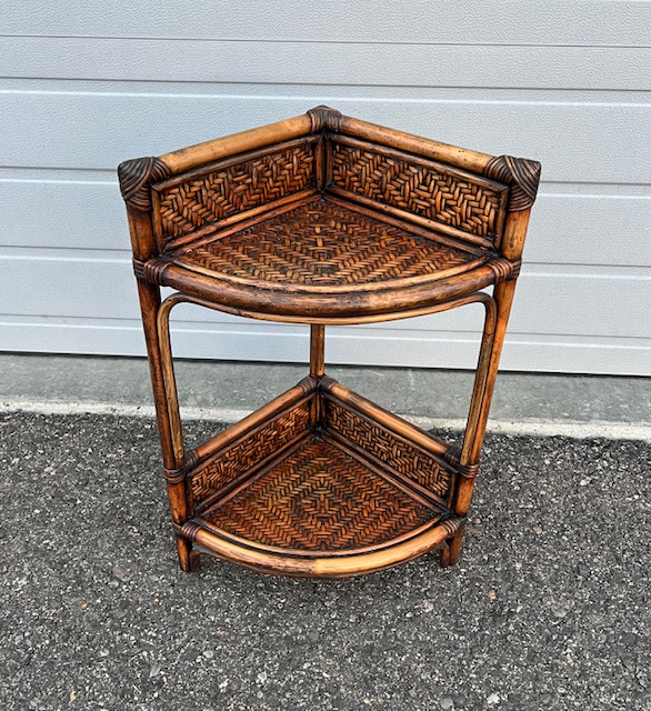 LIKE NEW Vintage Rattan 2-Level Corner Shelf (SKU# CB6/151):  Dimensions will be posted soon.