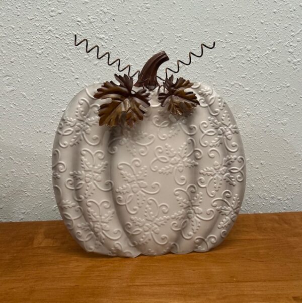 LIKE NEW White Metal Pumpkin and Fall Leaves Decor Item: Supported by angled stand. 12.5″ wide x 14″ tall.
