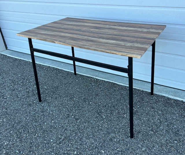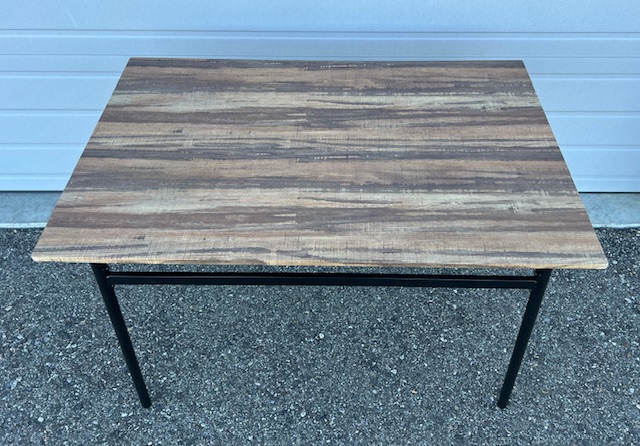 Modern Brown Pressboard Desk Table with Black Steel Base (CB6/486): Sturdy and in excellent condition! 43.5” long x 27.5” deep x 29.5” tall.