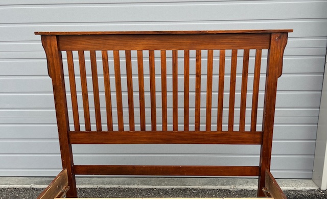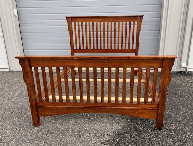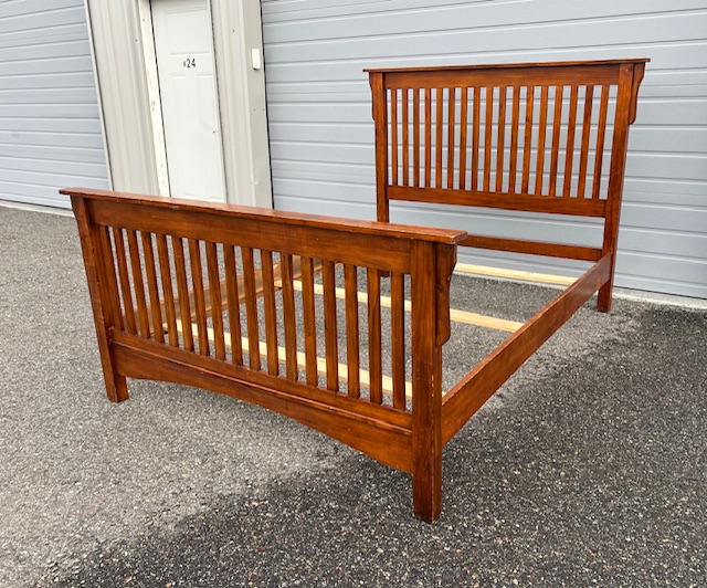 Oak Mission Style Queen Bed Frame (SKU# CB5/1421): Sturdy and in great condition, with a little bit of wear. 68″ wide x 87″ long x 54.5″ headboard height and 35.5″ footboard height.
