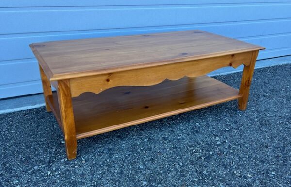 Quality 2-Level Knotty Pine Coffee Table with Decorative Edging (SKU# CB5/1342): Sturdy and in great condition, with a little bit of wear. 46″ long x 24″ deep x 16″ tall. $115 (Matching end table also available.)