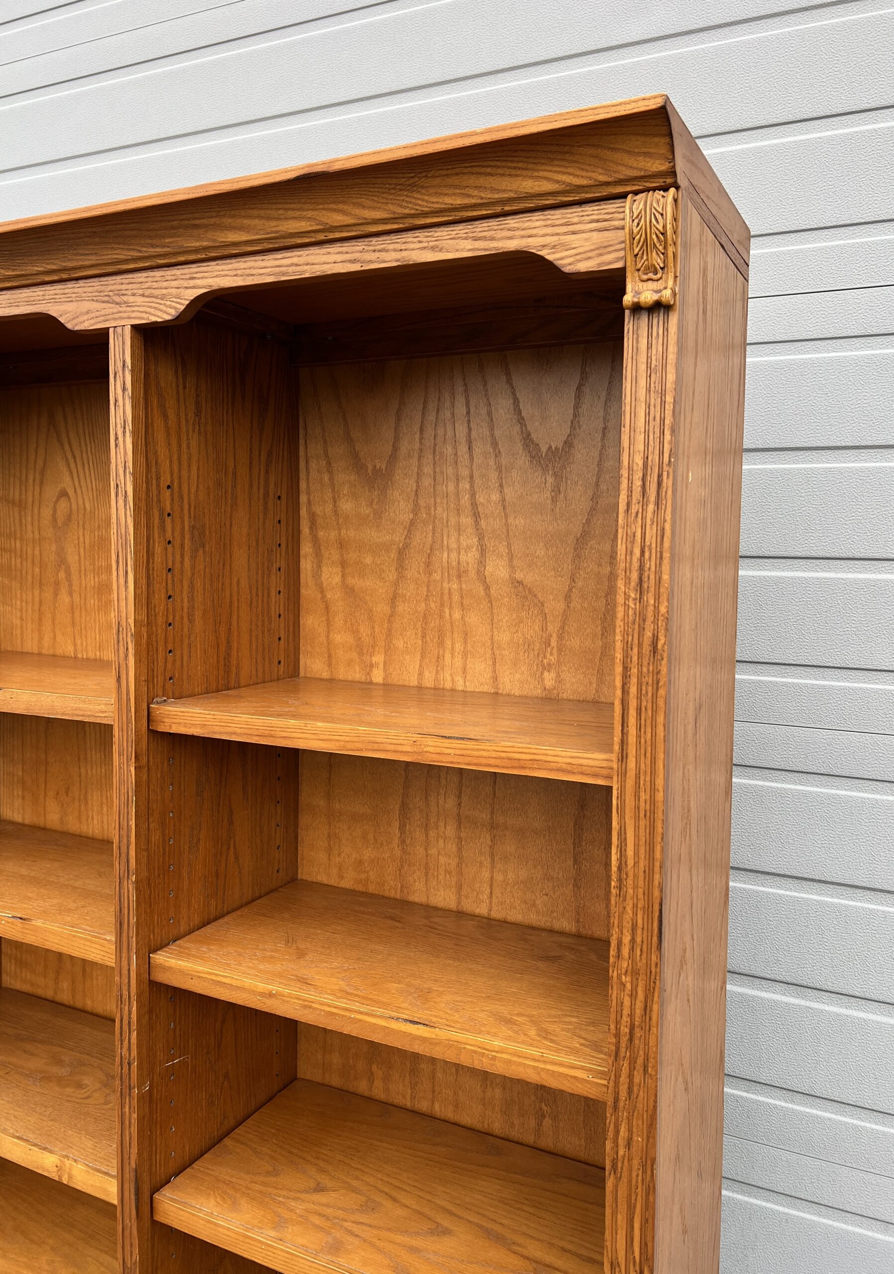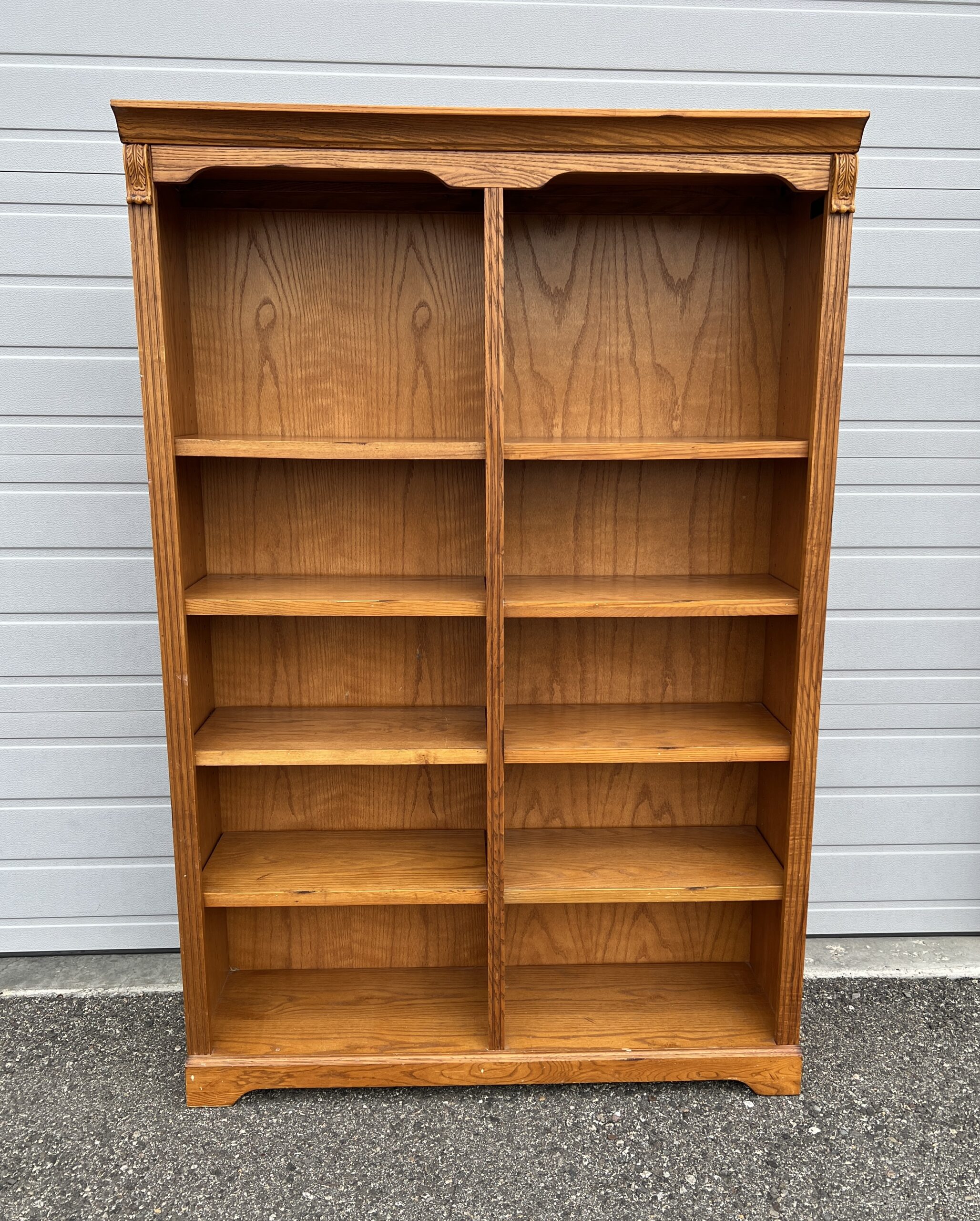 Quality Solid Oak 2-Section Bookcase with Top Edging and Carved Detail (SKU# CB6/388): Sturdy and in great condition, with a little bit of wear. Shelves are adjustable. 48″ wide x 14.5″ deep x 72″ tall.