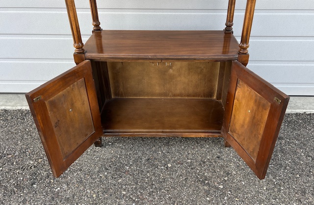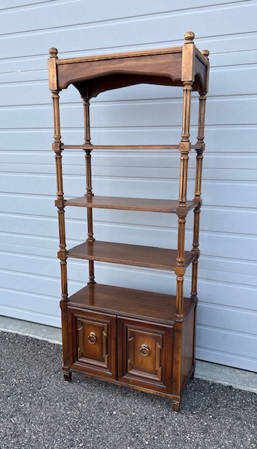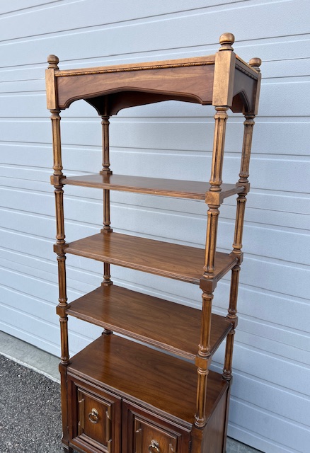 Quality Tall Mid-Century Solid Wood Shelf Unit with Top Decor Edging and Lower Cabinet (SKU# CB6/455): Sturdy and in great condition! 28″ wide x 14″ deep x 71.5″ tall.