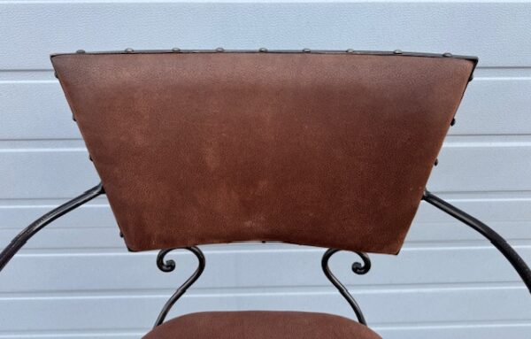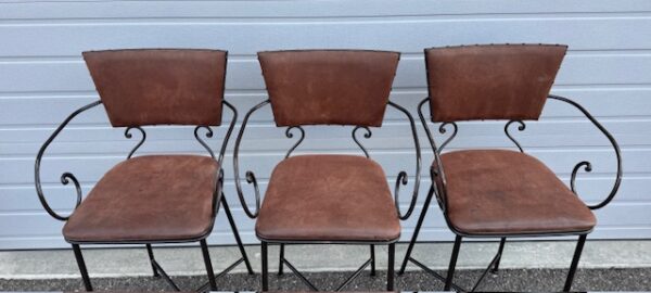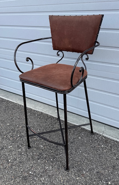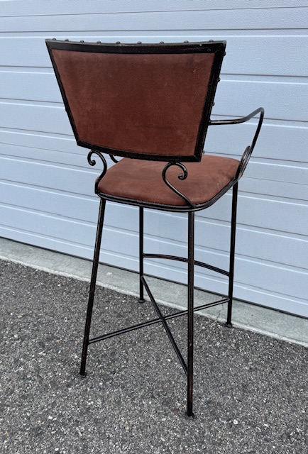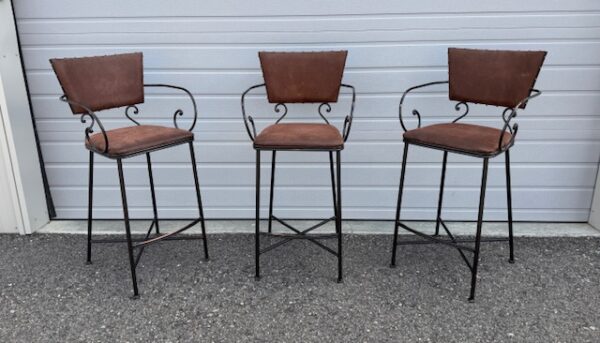 Quality Wrought Iron Bar Height Stools with Brown Microsuede Padded Seats (SKU# CB5/1327): Sturdy, comfortable, and in good condition. There is some staining on two of the seats, so they could use some cleaning. 22” wide x 20” deep x 31” seat height and 45” back height. Three (3) available at $60 each, sold as a set for $180.