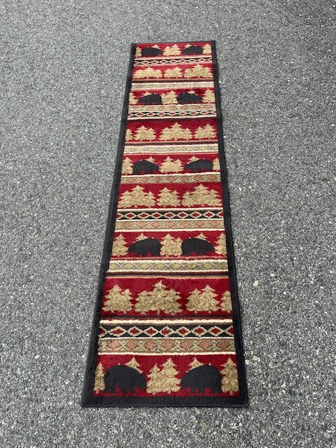 Red, Gold, & Black Bears and Evergreen Trees Runner Rug (SKU# CB5/714): Clean and in great condition! Rug pad included. 1′ 10″ x 7′ 6″. $30 (Matching larger area rug and 2 small rugs also available.)