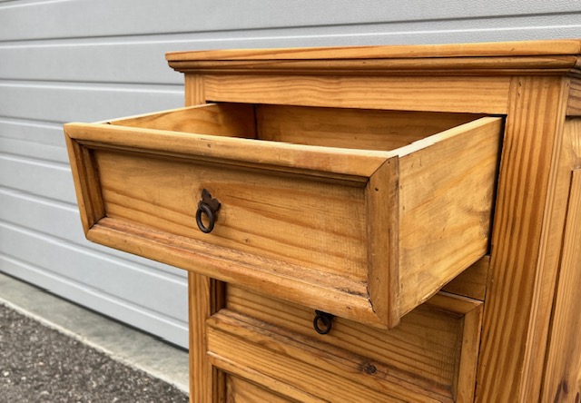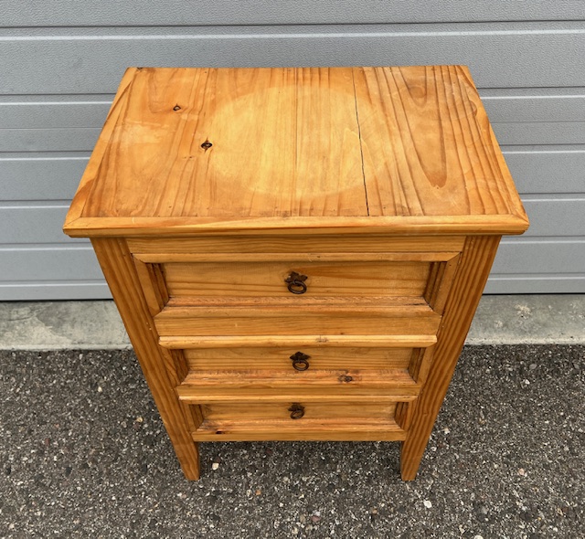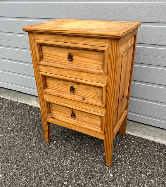 Rustic Mexican Pine 3-Drawer Dresser or Bedside Table : Very sturdy and in good condition! There is an area of discoloration on the top. Dimensions will be posted soon.