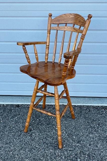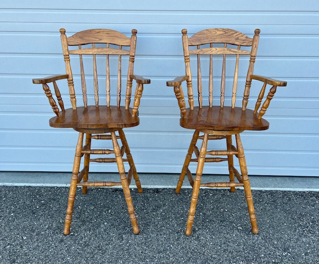 Solid Oak Bar Height Swivel Spindle Stools with Arms (SKU# CB5/1280): Sturdy and in great condition! 26″ wide (including arms) x 22″ deep x 30″ seat height and 49″ back height. Two (2) available at $75 each, sold as a set for $150.