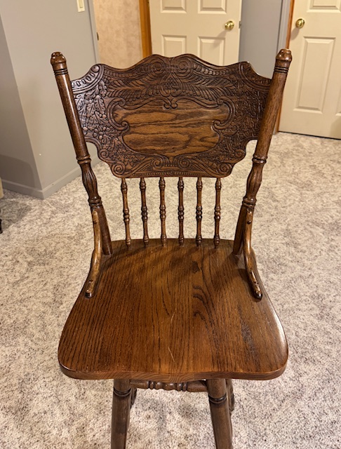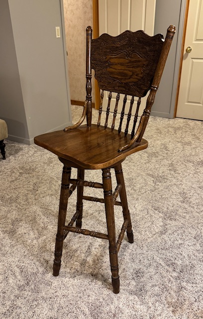 Solid Oak Pressback Bar Height Swivel Stool (SKU# CB6/177): Sturdy and in great condition! Seat height is 30.5″.