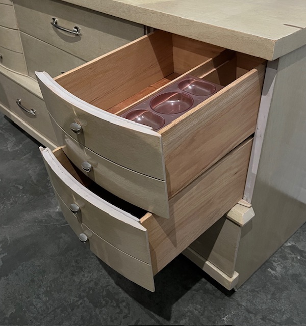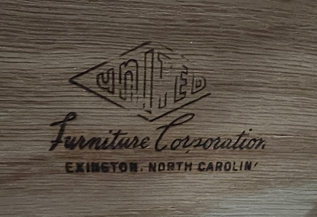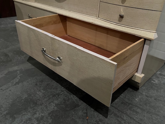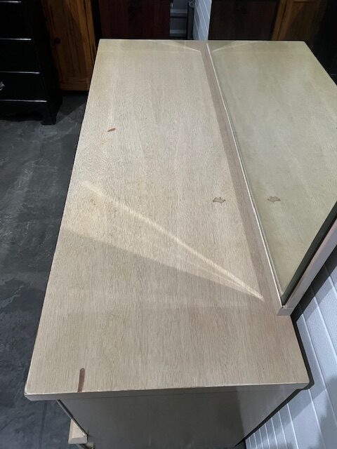 Spacious 8-Drawer Blonde Oak Mid-Century Dresser with Beveled Mirror (SKU# CB5/1442):  Quality dresser with heavy duty dovetailed drawers and curved top drawer panels.  Sturdy and in nice condition, with a little bit of wear.  Drawers work well.  Brand is United Furniture Corporation.  60″ long x 20″ deep x 32″ dresser height and 65.5″ overall height, including mirror.  $295  (Matching vertical dresser also available.)