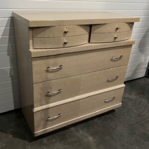 Spacious 8-Drawer Blonde Oak Mid-Century Dresser with Beveled Mirror (SKU# CB5/1442): Quality dresser with heavy duty dovetailed drawers and curved top drawer panels. Sturdy and in nice condition, with a little bit of wear. Drawers work well. Brand is United Furniture Corporation. 60″ long x 20″ deep x 32″ dresser height and 65.5″ overall height, including mirror. $295 (Matching vertical dresser also available.)